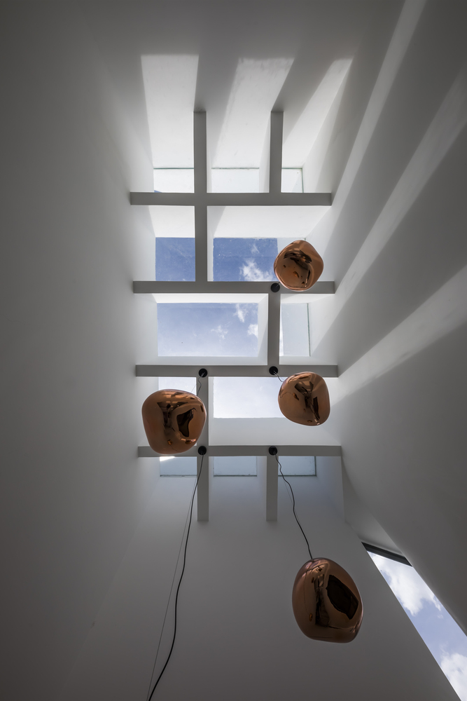 Không gian sinh hoạt chung và thư giãn được phân chia bằng giếng trời giữa nhà. Thông qua các không gian này, ánh sáng và gió được lan truyền một cách tự nhiên tạo cho ngôi nhà thông thoáng và mát mẻ. Phòng ngủ của bố mẹ tại tầng trệt được ngăn cách với không gian khách và bếp bởi khoảng thông tầng và khu vườn nhỏ giữa nhà.
