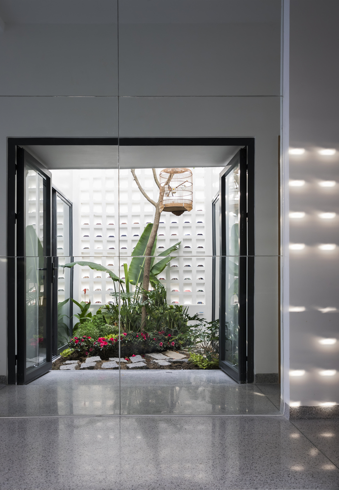 Kiến trúc sư đã sử dụng giải pháp đóng, mở gây sự thú vị cho người nhìn. Từ ngoài sân, tầm nhìn dần thay đổi khi bước vào trong, không gian mở rộng về chiều cao, phòng khách liên thông tầng 1, và độ cao của trần tại phòng ăn giảm dần khi đi qua hành lang kết nối ra sau nhà. Từ hành lang đó, không gian tiếp tục mở rộng và kết nối bếp, giếng trời, phòng ngủ của bố mẹ.