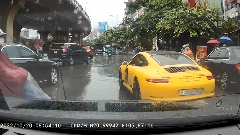 Trong đó, vụ việc xảy ra vào khoảng 8 giờ 52 phút sáng cùng ngày, lái xe ô tô gắn camera hành trình đang đi thẳng thì bất ngờ chiếc xe thể thao Porsche 911 màu vàng từ ngõ 622 phố Minh Khai quẹo phải ra, sau đó "tạt đầu" và chặn đường lái xe ô tô này.