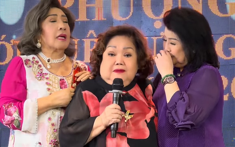 NSND Ngọc Giàu ôm Phượng Liên chia sẻ: "Hôm nay, phải lâu lắm rồi tôi mới được gặp lại Phượng Liên. Lệ Thủy thì ở Việt Nam nhưng cũng ít gặp lắm. Trường hợp mà gặp là phải có vấn đề chơi bời gì đó.