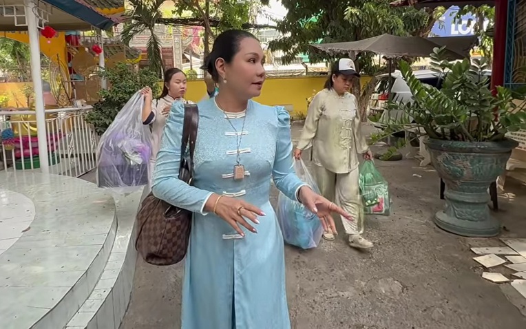 Nữ nghệ sĩ chia sẻ: "Mọi người biết tôi đang ở đâu không? Hôm nay tôi tới Chùa Nghệ Sĩ để thắp hương. Tôi đi hơi trễ vì đợi người mang hoa tươi đến cho tôi.