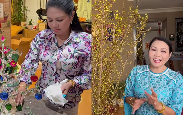 Bao nhiêu năm nay nhà tôi đều cắm mai trưng Tết. Chỉ còn vài ngày nữa là đến Tết rồi. Mùng 3 Tết tôi đã bay đi show rồi nên giờ phải cắm mai cho đẹp".