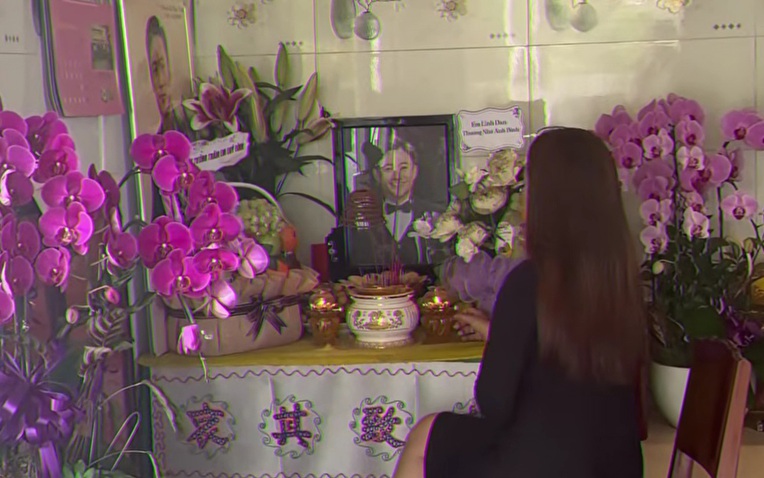 Vào trong nhà, Cát Tường tới bên di ảnh Quý Bình để thắp nhang. Bên cạnh ban thờ có khá nhiều lẵng hoa lan lớn được gửi tới từ các đồng nghiệp. Điều đó cho thấy, Quý Bình sống rất tốt với mọi người xung quanh nên dù đã đi xa nhưng bạn bè đồng nghiệp vẫn nhớ tới anh.