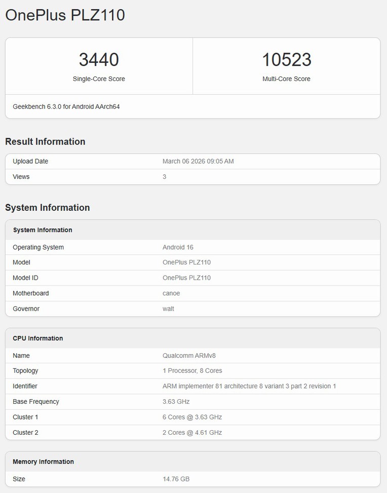 Mẫu điện thoại OnePlus 15T, với số model PLZ110, gần đây đã được phát hiện trên nền tảng chấm điểm Geekbench. Sự xuất hiện này diễn ra sau khi thiết bị đạt điểm số 4,45 triệu trên AnTuTu.