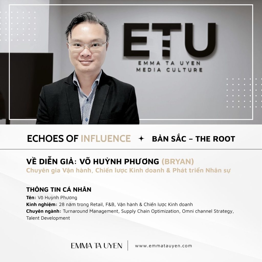 Trong khuôn khổ dự án Echoes of Influence, workshop mở đầu với chủ đề "BẢN SẮC – THE ROOT" chính thức giới thiệu diễn giả Võ Huỳnh Phương (Bryan) – chuyên gia với hơn 28 năm kinh nghiệm trong lĩnh vực vận hành, chiến lược kinh doanh và phát triển nhân sự.