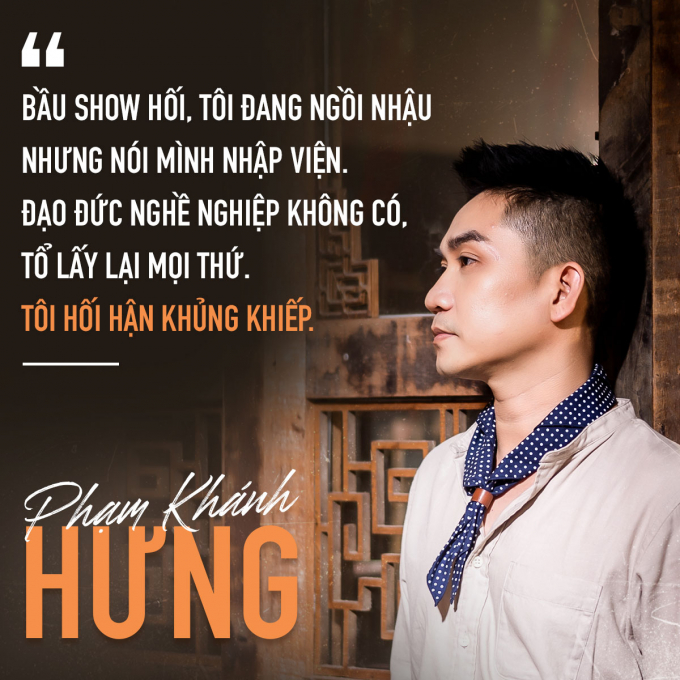 Show dày đặc, nhiều lúc lên sân khấu ho thì thú thật với khán giả là "Hưng đang bệnh". Khán giả cũng chấp nhận và chỉ muốn tôi có mặt là được. Có lần đang ngồi nhậu quên cả show diễn, tôi báo lên bầu show rằng hôm nay bị tiêu chảy không thể đến được. Đạo đức nghề nghiệp không có thì Tổ lấy lại là chuyện bình thường. Sau này hối hận khủng khiếp.