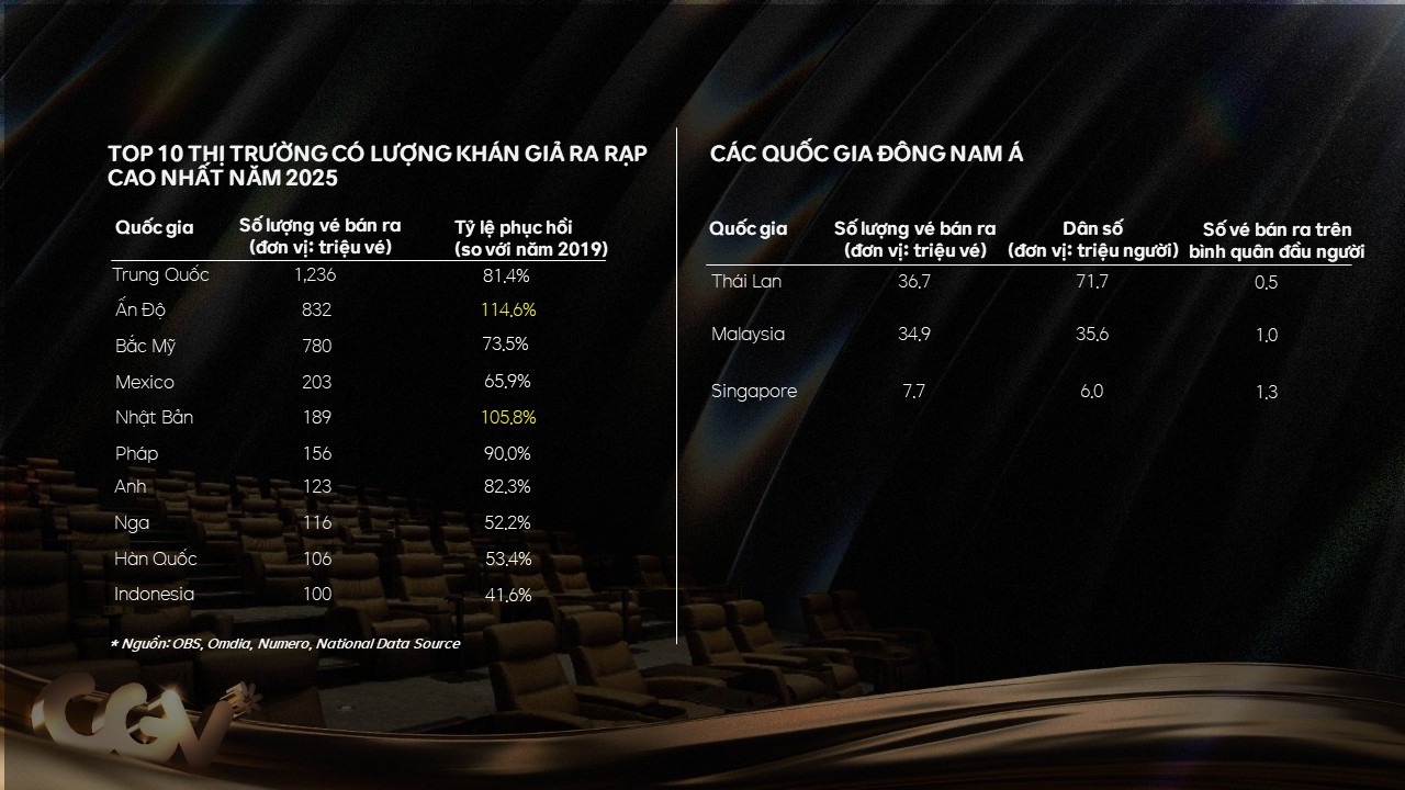 Trong khi nhiều thị trường quốc tế vẫn đang nỗ lực để quay lại mức doanh thu phòng vé trước dịch, điện ảnh Việt Nam không chỉ nhanh chóng phục hồi mà còn bước vào giai đoạn tăng trưởng mạnh mẽ. Báo cáo của CGV cũng cho thấy trong giai đoạn 2023 – 2025, mức tăng trưởng doanh thu phòng vé hàng năm của Việt Nam đạt trên 20%.