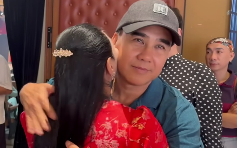 MC - Phó chủ tịch Hội điện ảnh Việt Nam Quyền Linh ăn mặc khá giản dị, chỉ đội mũ lưỡi trai và mặc áo phông đứng ngoài cửa, vừa thấy Ngọc Huyền tới liền ôm chặt đàn em.