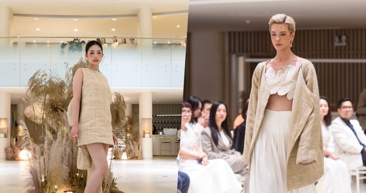 Nếu Châu Anh mang đến hình ảnh nền nã, chuẩn mực và gắn liền với tinh thần trách nhiệm cộng đồng, thì Hà Kino lại xuất hiện đầy phóng khoáng và tự do ở vị trí vedette. Người mẫu diện thiết kế làm từ vải gai dầu dệt tay, xử lý hoàn toàn thủ công, với áo khoác dáng rộng kết hợp chân váy trắng suông dài mang tinh thần unisex – dung hòa giữa đường nét mạnh mẽ và sự mềm mại của chất liệu tự nhiên.