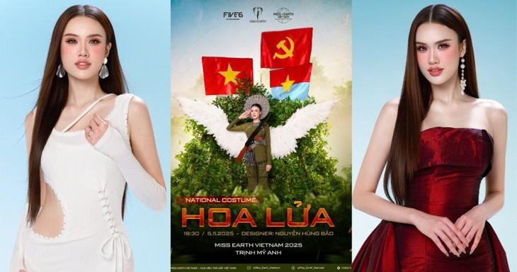 Đặc biệt, “Hoa Lửa” gây ấn tượng mạnh với tông màu xanh rêu đặc trưng của người chiến sĩ, kết hợp cùng chiếc khăn rằn, mũ mấn, và đôi cánh trắng tượng trưng cho sự hi sinh, nhưng cũng là biểu tượng của hòa bình và lòng nhân hậu. Phía sau là hình ảnh ba lá cờ – biểu trưng cho tổ quốc, lý tưởng và tinh thần đoàn kết dân tộc – làm nổi bật hơn thông điệp yêu nước và tự hào dân tộc mà bộ trang phục muốn truyền tải. Trịnh Mỹ Anh thể hiện thần thái vừa kiên cường, vừa mềm mại – như chính tinh thần “hoa lửa”: bừng cháy giữa gian khổ, dịu dàng giữa bão giông.