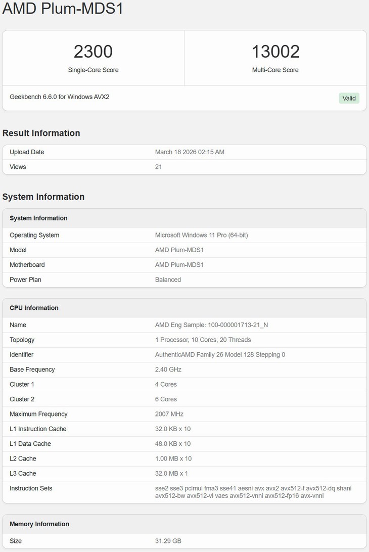 Đáng chú ý, đây là lần đầu tiên Geekbench ghi nhận hỗ trợ FP16 "AVX-VNNI" trên kiến trúc Zen 6, cho phép các APU Medusa Point xử lý tốt hơn các tác vụ sử dụng tập lệnh FP16, tăng tốc cho nhiều loại khối lượng công việc.