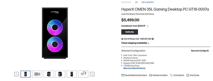 Máy tính OMEN 35L mới sẽ được trang bị Core Ultra 7 270K Plus kết hợp cùng card đồ họa NVIDIA GeForce RTX 5070. Phiên bản với 16 GB RAM và 1 TB lưu trữ có giá niêm yết là 5.499 USD (~145,2 triệu đồng). Tuy nhiên, HP cho biết đây chỉ là mức giá tạm thời và có thể thay đổi khi sản phẩm chính thức ra mắt.