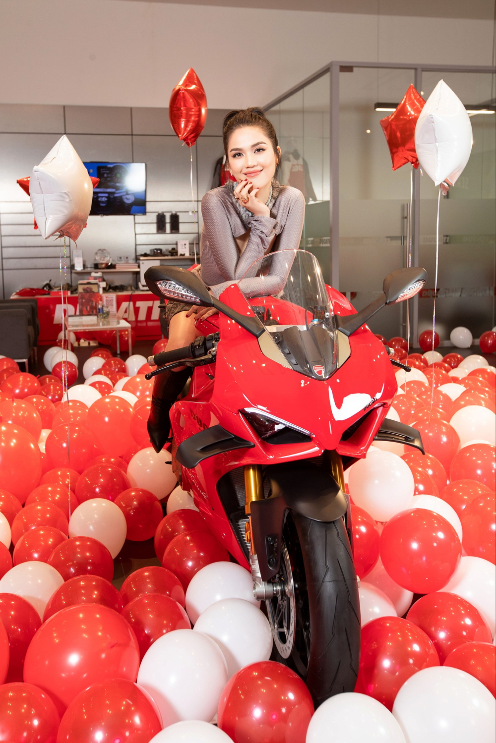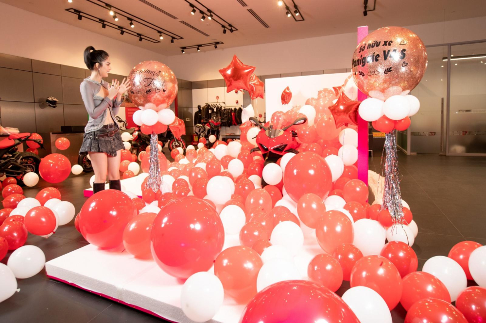 Hình ảnh do đơn vị bán xe Ducati Panigale V4 S 2023 cho Ngọc Trinh chia sẻ cho thấy, chiếc siêu mô tô phân khối lớn được đóng gói trong hộp quà màu hồng khá lớn, bên trong chứa hàng trăm quả bong bóng, và đây có lẽ là màn nhận xe mơ ước của không ít chị em.