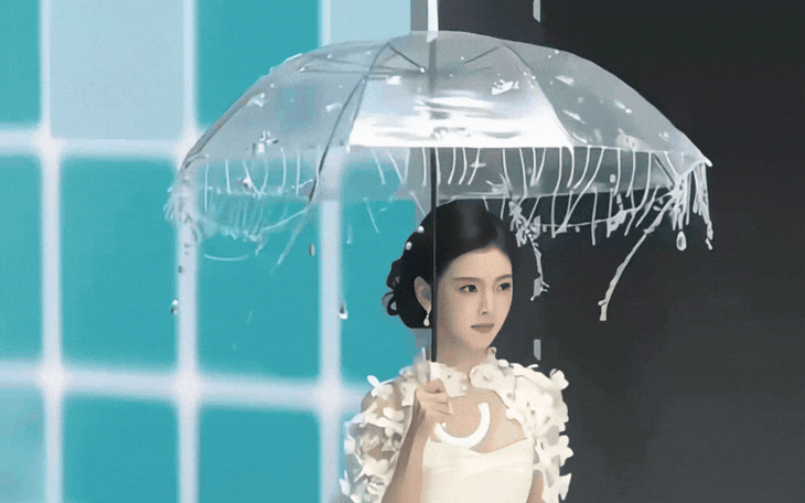 Đỉnh điểm của thảm họa chính là chiếc ô trong suốt được trang trí rua hoa giấy. Đạo cụ này không chỉ thừa thãi mà còn khiến tổng thể trở nên quá lố, Chương Nhược Nam giống như đang hoá thân thành một cô dâu chuẩn bị chụp ảnh cưới ở thập niên 60.