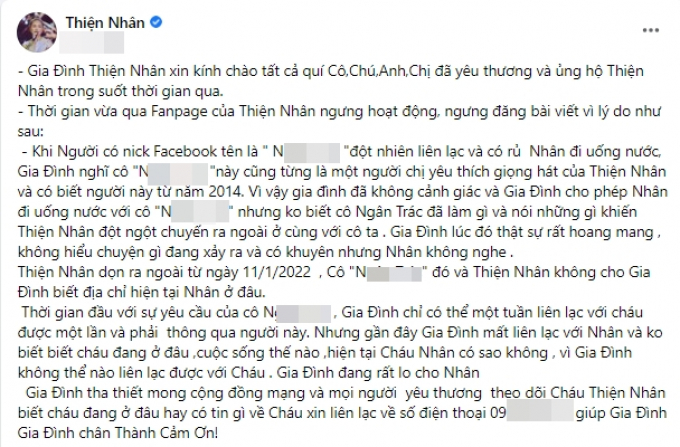 Bài đăng của gia đình Thiện Nhân kêu cứu rằng nữ ca sĩ đã bỏ nhà ra đi, mất liên lạc nhiều ngày qua
