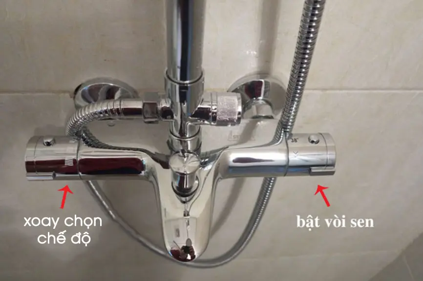 Phần van vặn bên trái sản phẩm để điều chỉnh nhiệt độ nước. Phần van vặn bên phải là điều chỉnh chế độ phun nước. Trên phần củ sen có hướng dẫn bạn có thể nhìn vào hình ảnh minh họa đó để điều chỉnh nhiệt độ phù hợp nhất.