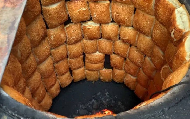 Bí quyết nằm ở cái lò nướng đặc biệt làm từ chum sành. Ở nhiệt độ 300 độ C, người thợ thoăn thoắt dán từng miếng bột lên thành chum. Lửa than cháy đượm nướng bánh chín vàng ươm, phồng lên như những chiếc trống con, mặt rắc đầy mè trắng thơm phức. Cắn một miếng, tiếng vỏ bánh vỡ ra rôm rốp vui tai, từng lớp bột mỏng tang như giấy quyện với vị mặn mòi, béo ngậy tan ngay đầu lưỡi.