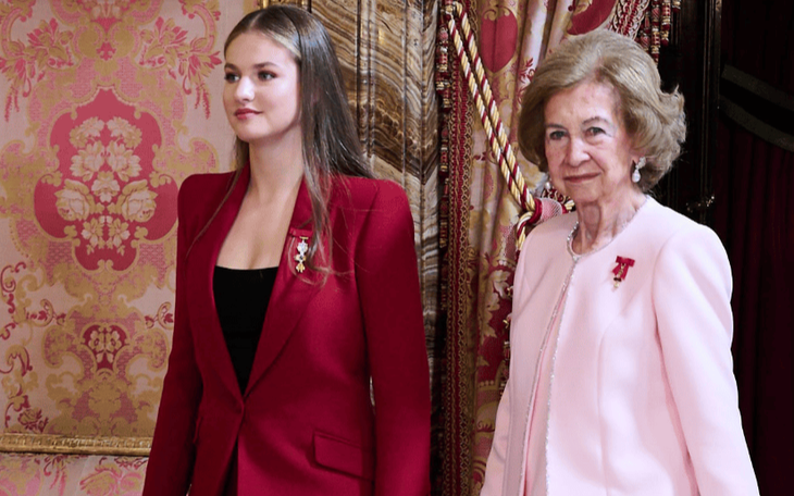 Hiếm hoi lắm người ta mới thấy cả ba người phụ nữ quyền lực nhất Hoàng gia Tây Ban Nha cùng xuất hiện rạng rỡ đến thế. Trong khi bà nội - Vương hậu Sofía 87 tuổi nhận huân chương danh giá với vẻ đằm thắm, dịu dàng thì cô cháu gái Leonor lại khiến truyền thông bùng nổ với bộ vest đỏ rực lửa.