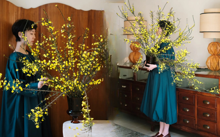 Mùa xuân nằm trọn trong một bình Nghênh Xuân: Sắc vàng rực rỡ, cành rủ mềm mại như suối tóc, chưng Tết vừa sang vừa hút lộc