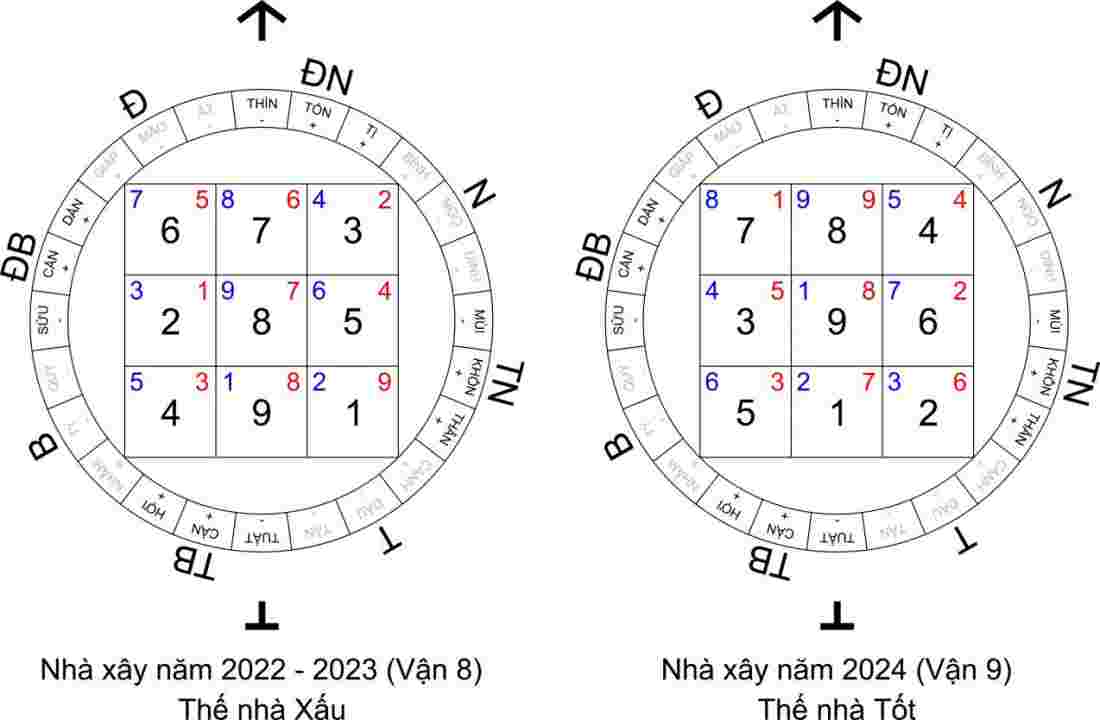 Ví dụ: Hướng nhà 120 độ, hướng Đông Nam 1 (tọa Tuất hướng Thìn). Thời điểm hiện tại là năm 2022 đang cuối vận 8, đầu vận 9. Nếu bạn xây nhà trong năm 2022 hoặc 2023 (vận 8), thì thế nhà này là Thượng Sơn Hạ Thủy, là 1 thế nhà xấu. Nhưng nếu bạn đợi đến năm 2024 (vận 9) mới xây, thì thế nhà này đổi thành Song Tinh Đáo Hướng , là 1 thế nhà tốt.