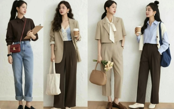 Có lần hẹn café sáng với bạn thân, cả hai đều vô tình diện màu trà sữa. Cô ấy mặc cardigan yến mạch, áo len cổ cao trắng kem, chân váy nâu nhạt; tôi thì trench coat kaki nhạt, áo sơ mi xanh khói, quần ống rộng trắng sữa. Hai đứa vừa ngồi xuống, cô gái bàn bên liền chạy sang xin link: "Hai chị mặc như… mang cả mùa thu lên người vậy!".