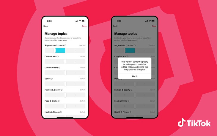 Theo thông báo, tính năng sẽ được triển khai trong “vài tuần tới” và xuất hiện trong phần "manage topics" của ứng dụng, nơi người dùng tùy chỉnh nhóm nội dung mà họ muốn xem nhiều hoặc ít hơn. TikTok cho biết lựa chọn mới nhằm giúp người dùng "giảm tải" nội dung AI nếu không muốn các video này chiếm quá nhiều trong luồng đề xuất. Trước đó, Pinterest cũng đã phải điều chỉnh thuật toán khi nhiều người phàn nàn rằng hình ảnh do AI tạo ra đang lấn át nội dung thật.