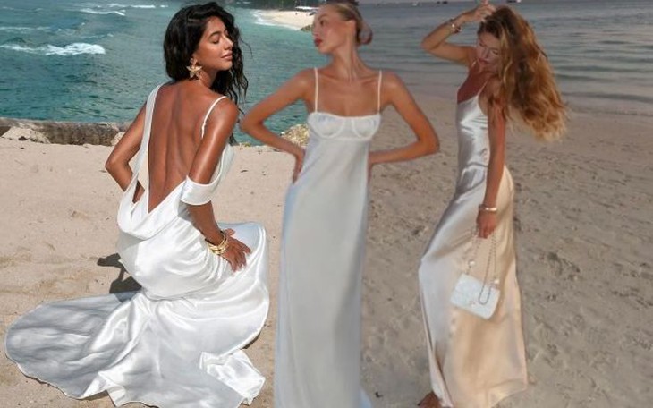 Chất liệu satin / rũ nhẹ Những chiếc váy trắng trong hình chủ yếu sử dụng chất liệu satin hoặc vải có độ rũ cao, với bề mặt bóng nhẹ tinh tế. Dưới ánh sáng tự nhiên nơi bãi biển, chất liệu này phản chiếu ánh sáng theo nhiều lớp, khiến sắc trắng không hề đơn điệu mà giống như một “tác phẩm chuyển động”, toát lên khí chất sang trọng.