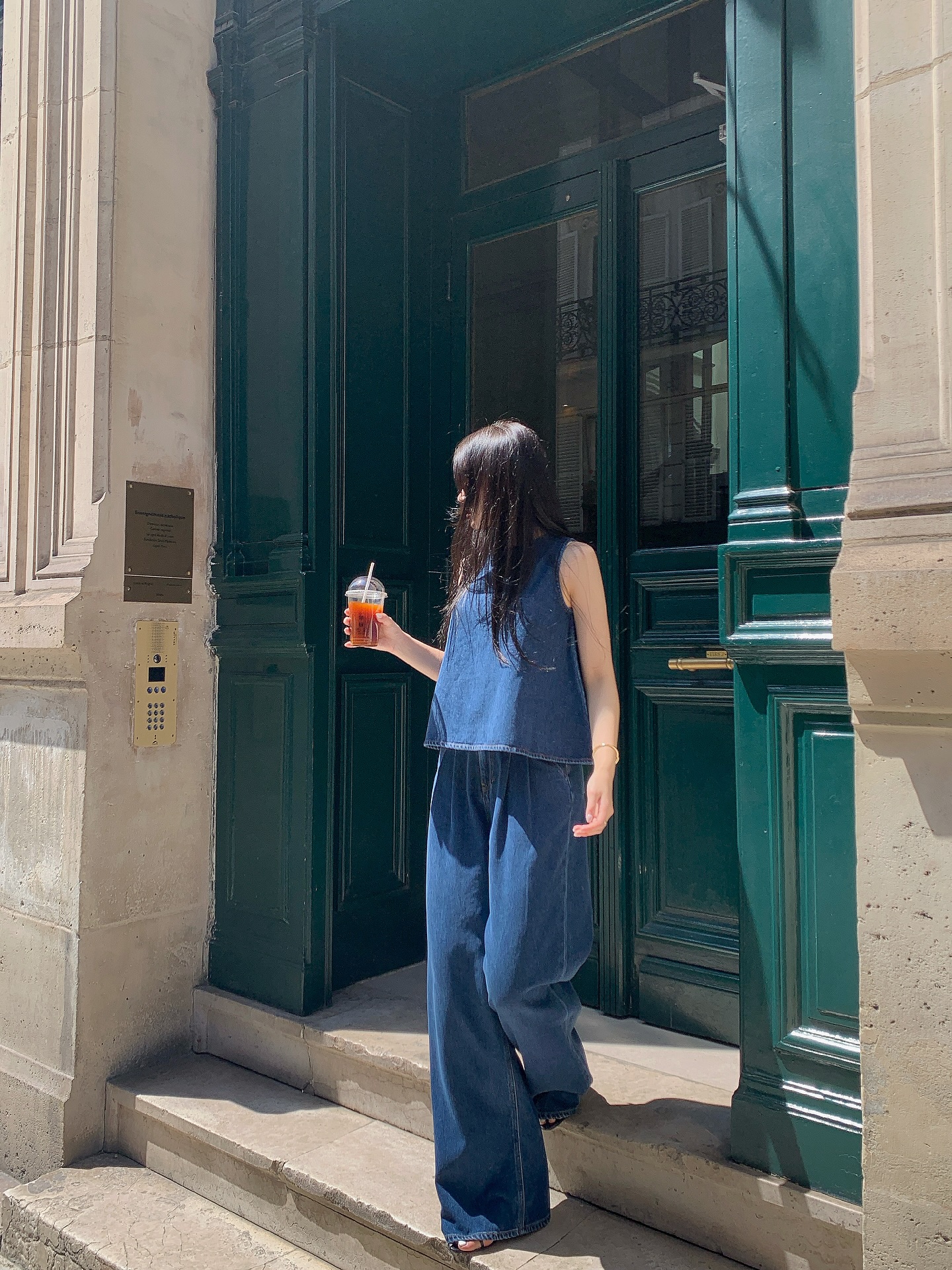 Phối denim với denim từng bị xem là khó mặc, nhưng thực tế lại cực kỳ phù hợp với phong cách tối giản nếu bạn biết cách tiết chế. Một chiếc áo gile chất liệu denim hoặc áo sơ mi denim kết hợp cùng quần jeans cùng tông hoặc lệch tông nhẹ sẽ tạo nên tổng thể đồng nhất và cá tính.