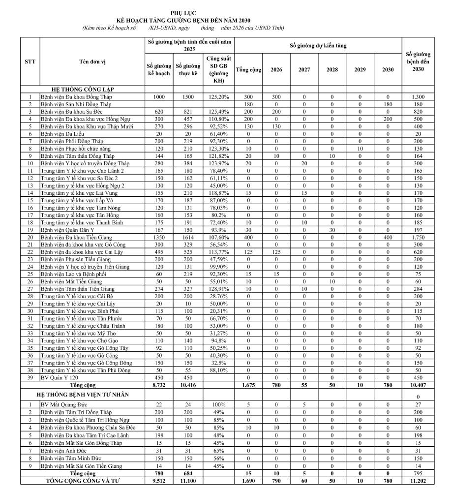 Theo kế hoạch, tổng số giường bệnh toàn tỉnh Đồng Tháp dự kiến tăng từ 9.512 giường (kế hoạch) lên khoảng 11.202 giường vào năm 2030, bao gồm cả hệ thống công lập và tư nhân.