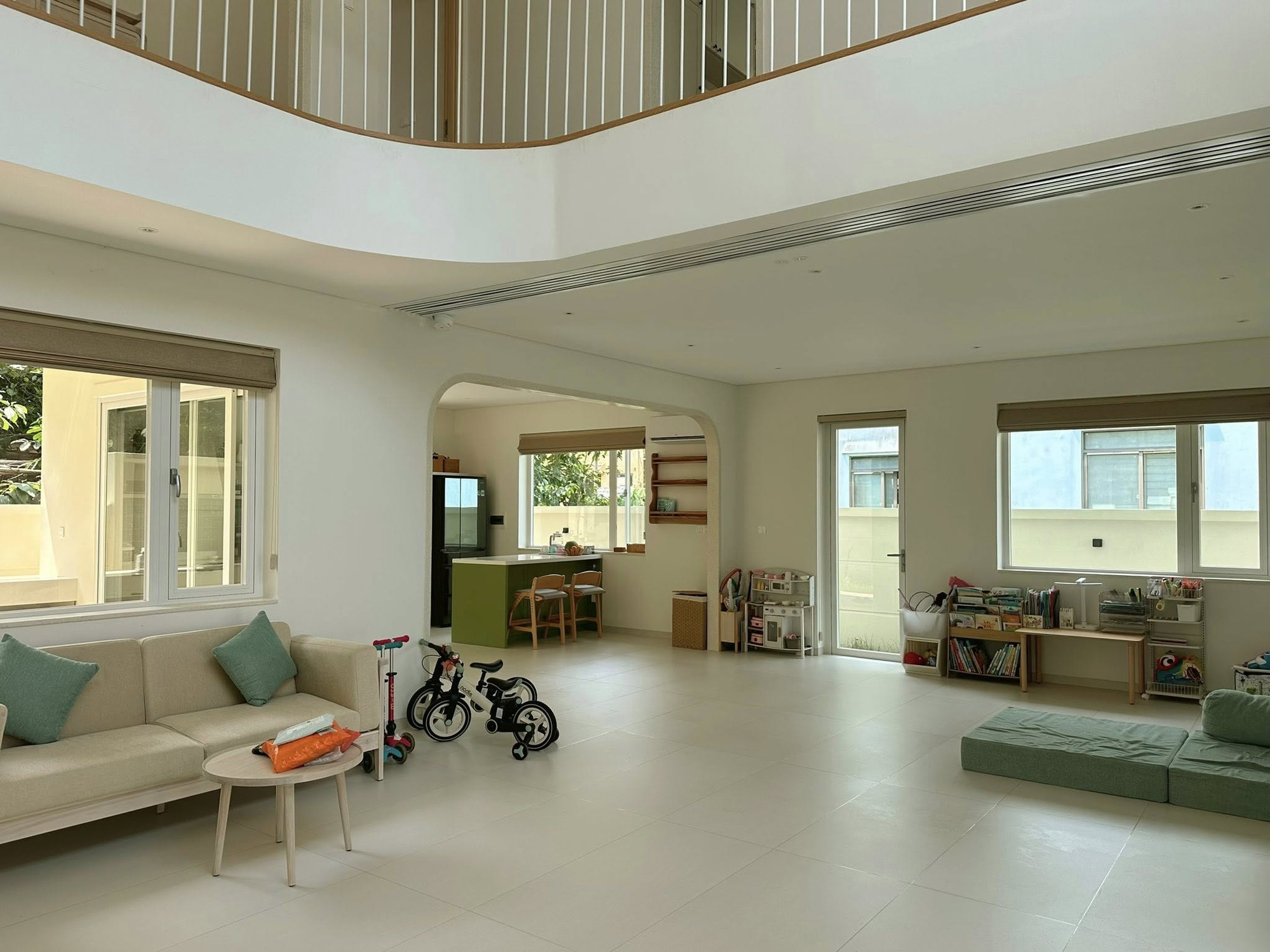 Điều thú vị là, dù có phòng riêng ở tầng trên, các bé lại rất thích ở không gian chung này. Ngay cả những kỳ nghỉ dài, khi không đi du lịch, ngôi nhà vẫn đủ để các bé bày đủ trò. "Trong nhà chán thì ra sân chơi, giống như hồi trước ở chung cư thì ra ban công hoặc xuống tầng tiện ích".
