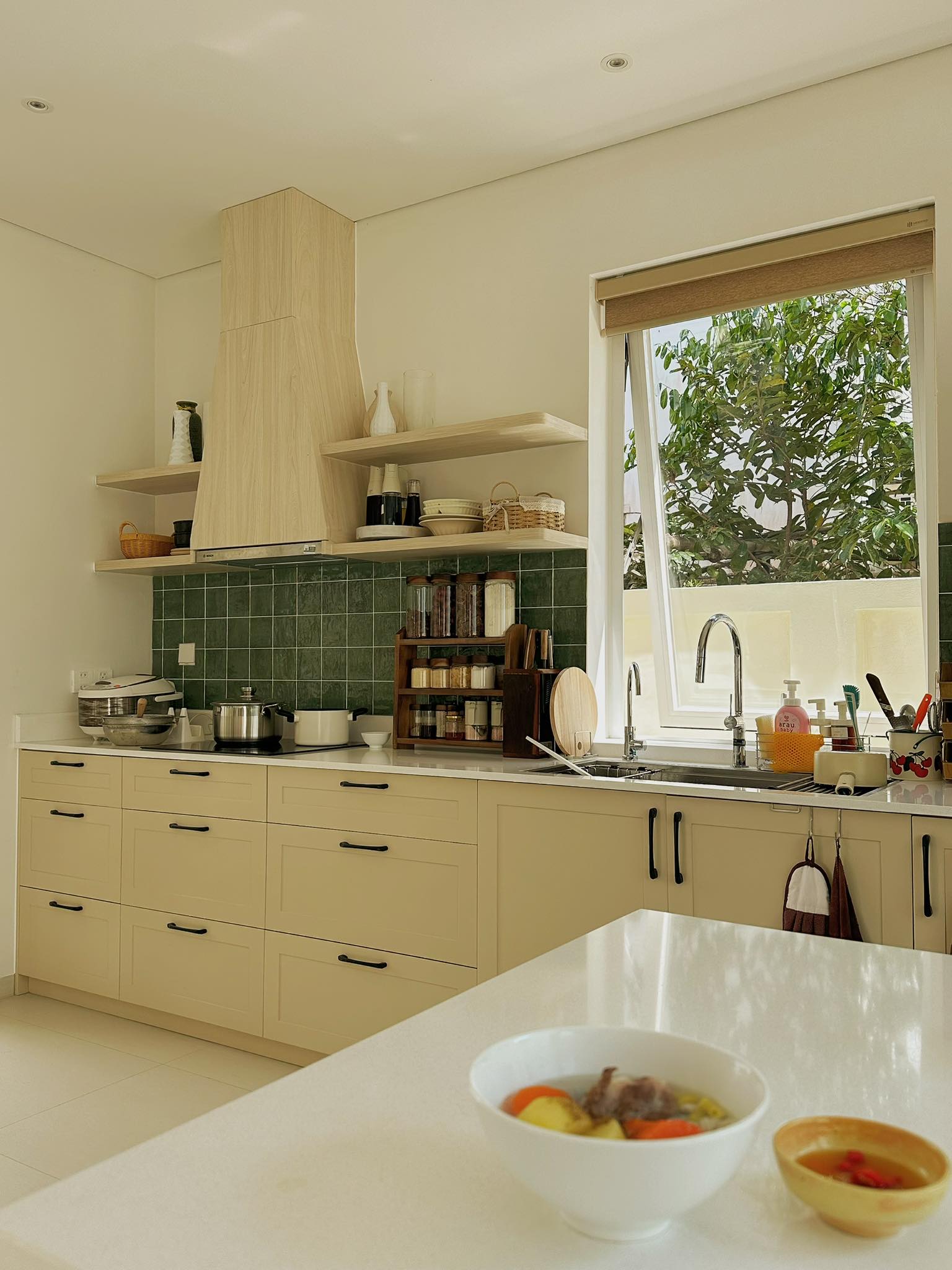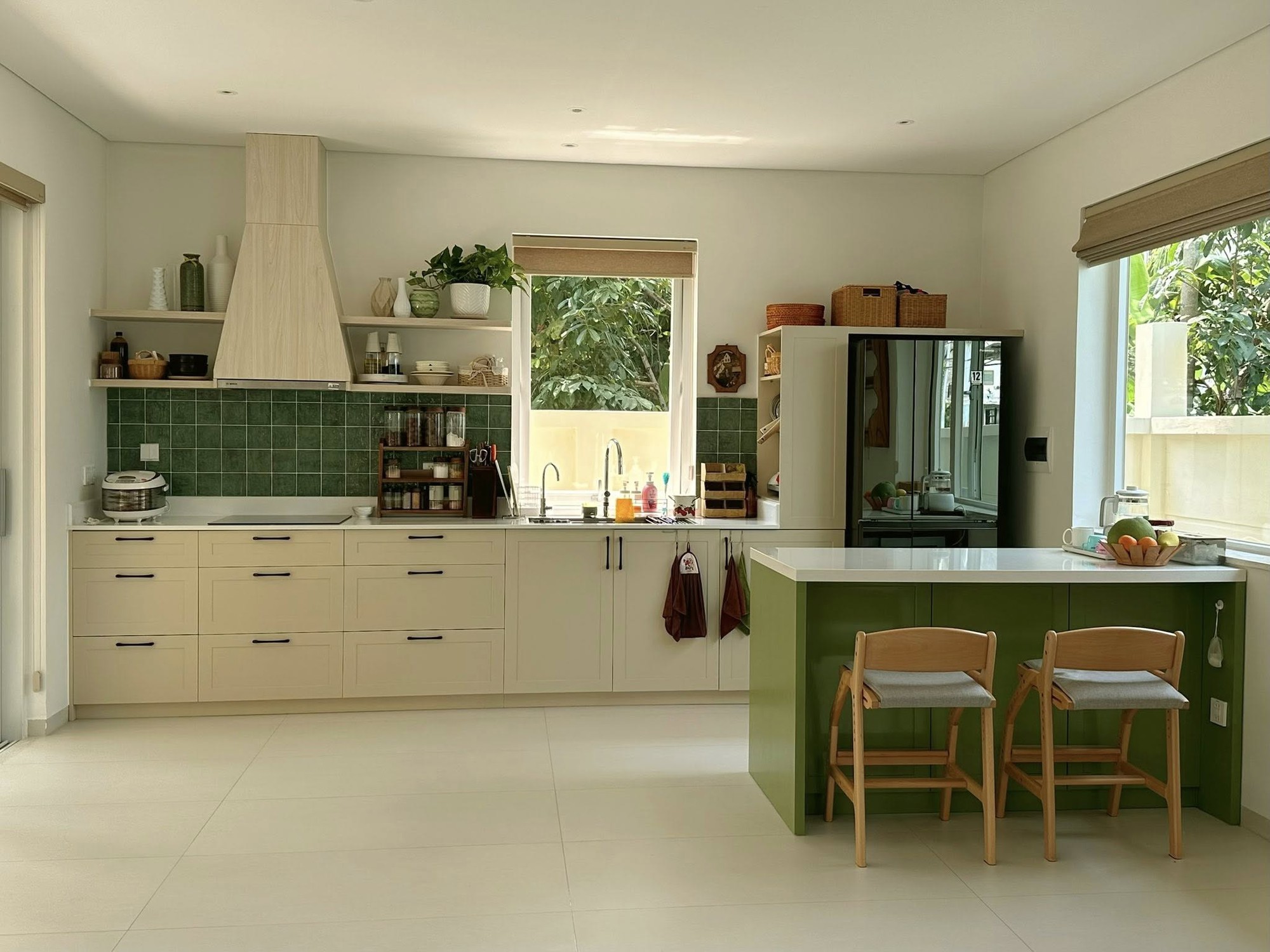 Căn bếp được thiết kế theo dạng chữ I, kết hợp với đảo bếp nhỏ. Nhờ hệ cửa kính bao quanh, không gian luôn tràn ngập ánh sáng tự nhiên. Bảo Nhi thậm chí còn mạnh dạn loại bỏ tủ bếp trên để tạo cảm giác thoáng đãng cho không gian bếp. "Bếp chữ I và đảo bếp là đủ dùng cho cả nhà, nên mình bỏ tủ trên để không gian nhẹ và xinh hơn".