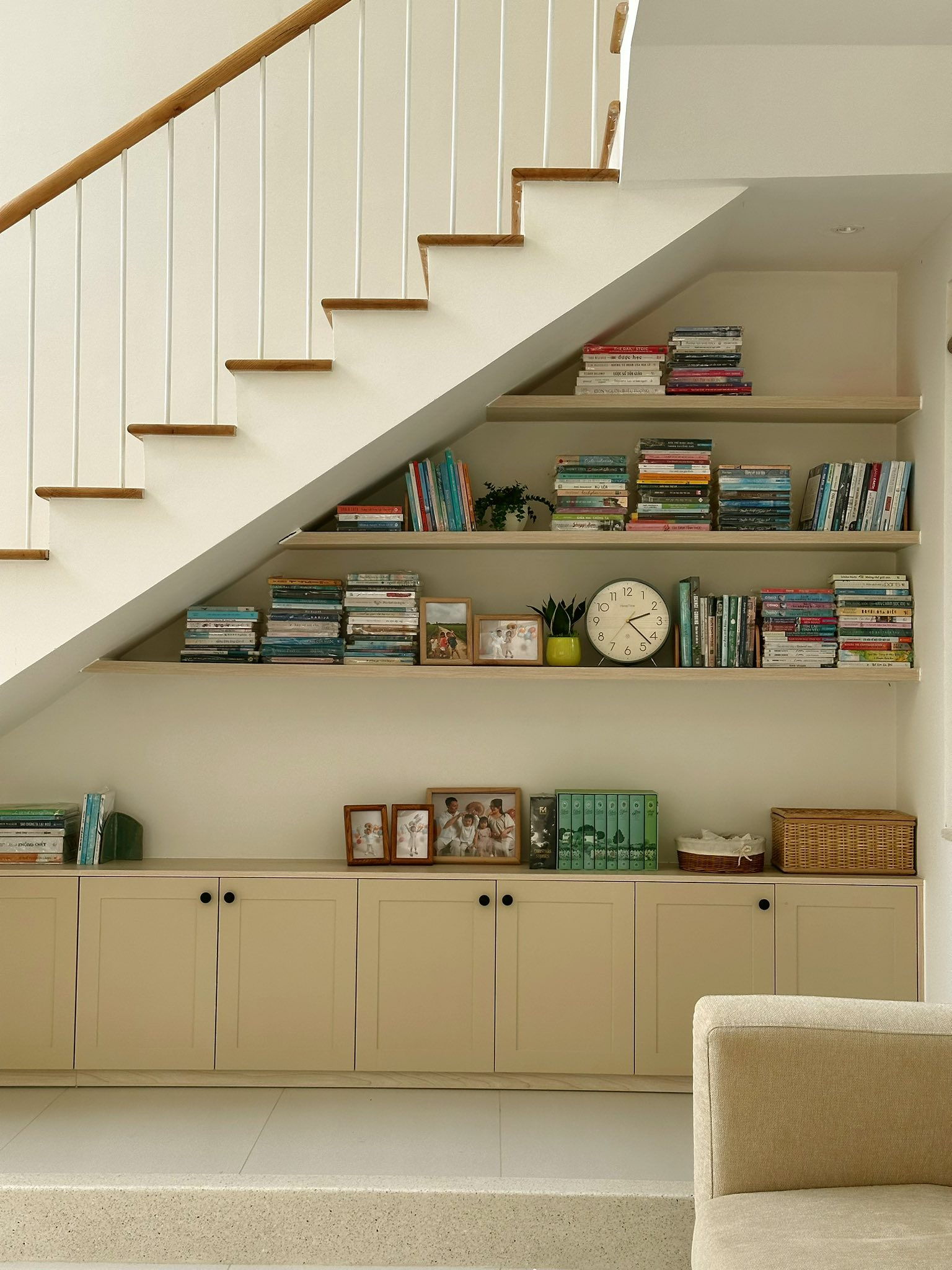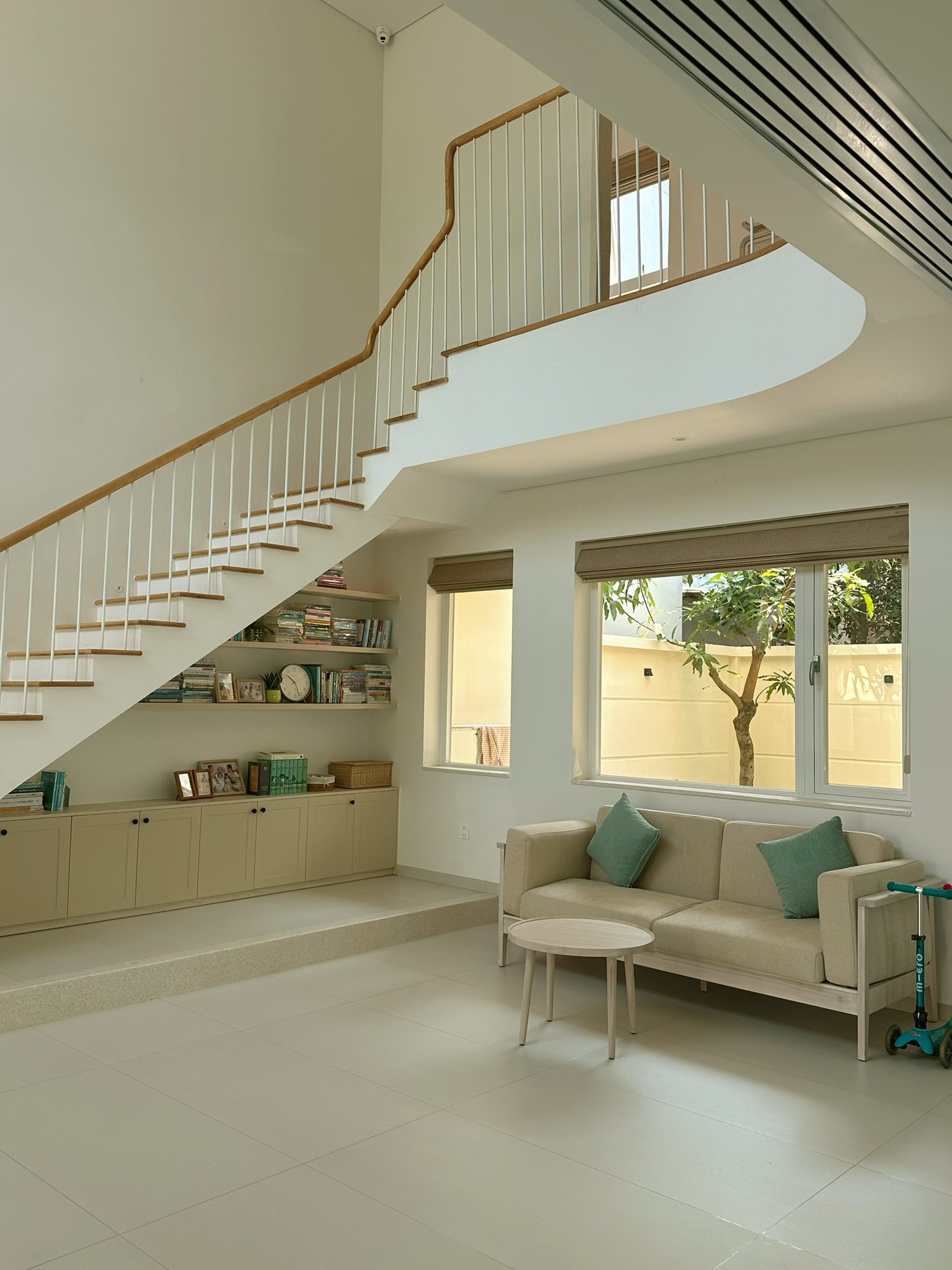 Không gian tầng trệt không chỉ là nơi sinh hoạt chung, mà gần như là trung tâm của toàn bộ đời sống gia đình. "Những ngày con không đi học, phần lớn thời gian cả nhà mình sẽ ở đây. Ba mẹ làm việc, các con chơi, hoặc cùng nhau làm những điều mình thích".