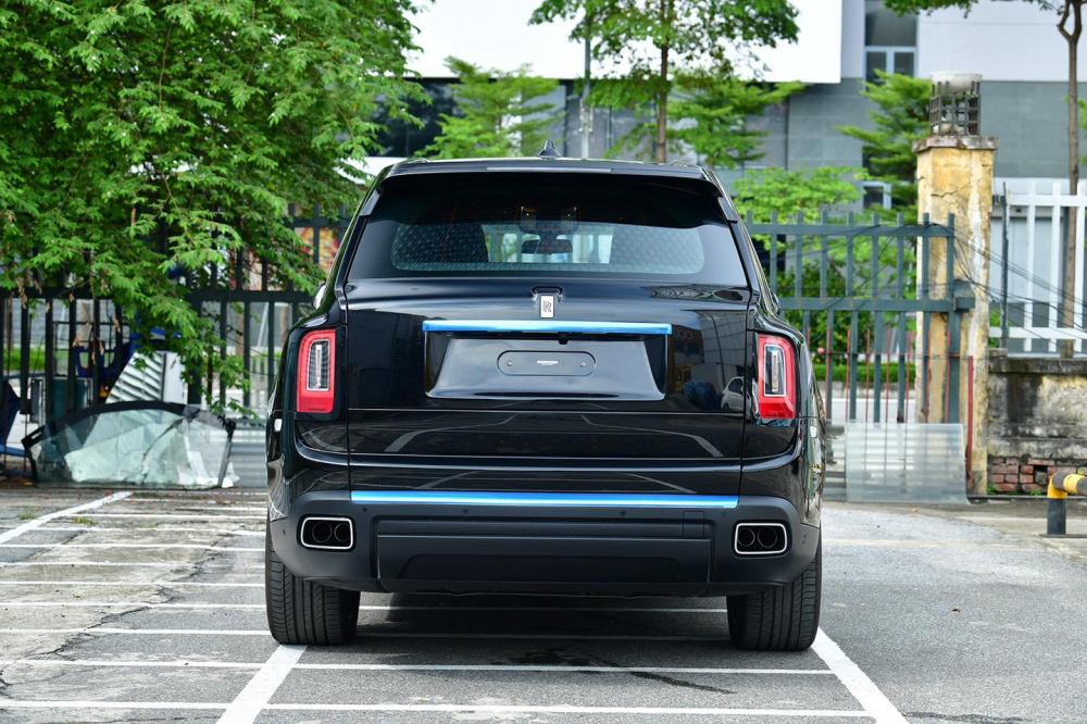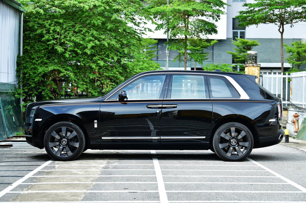 Nhìn bên ngoài, chiếc SUV siêu sang Rolls-Royce Cullinan này có màu sơn quen thuộc là đen bóng, đây cũng là bộ áo đặc trưng của các xe Rolls-Royce Cullinan đang lăn bánh tại dải đất hình chữ S. Điểm nhấn của xe còn có bộ mâm 7 chấu đơn sơn màu tối với cách xử lý màu xước khá lạ mắt. Ngoài ra còn có đường kẻ coachline chạy dài bên hông xe hoàn thành màu cam nổi bật.