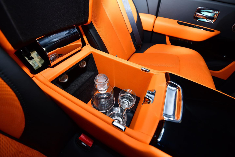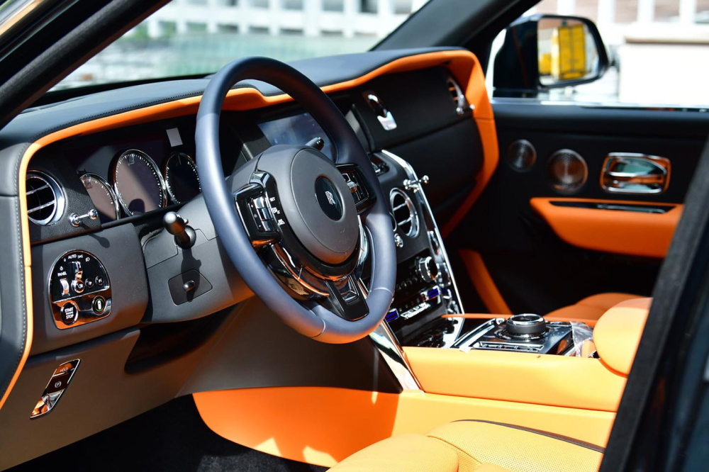 Mở cửa bước vào trong khoang lái, nội thất chiếc SUV siêu sang Rolls-Royce Cullinan gây choáng ngợp trước tông màu cam sặc sỡ. Bên cạnh đó, còn có nhiều chi tiết sơn đen hay ốp gỗ cao cấp.