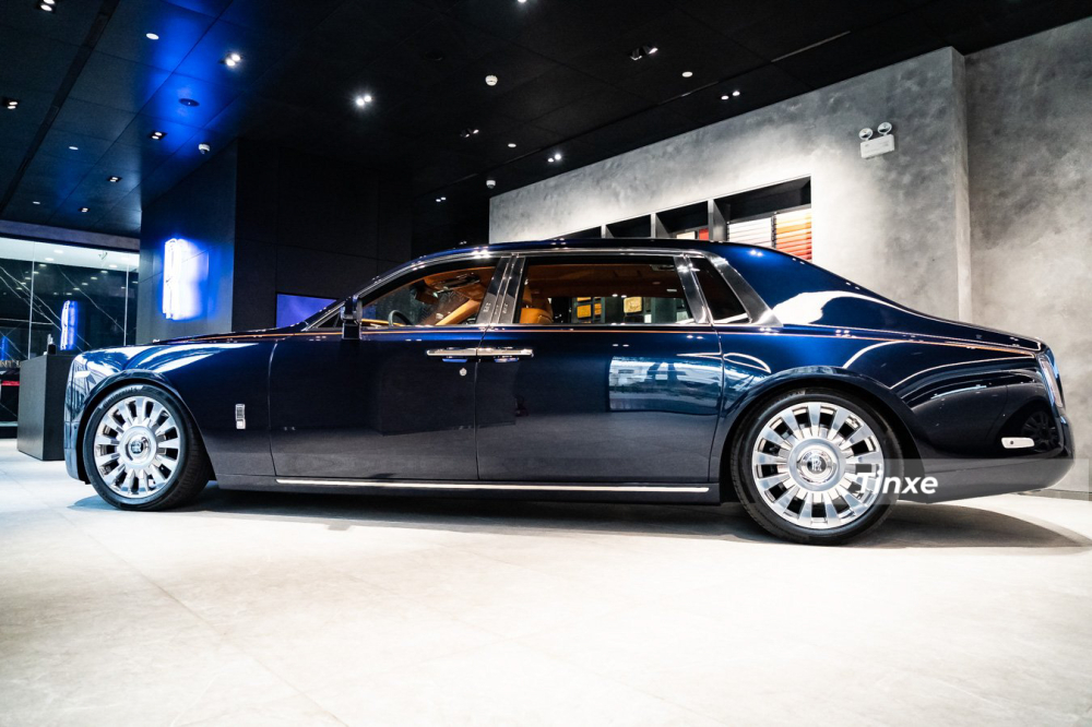 Khác với 2 bộ áo yêu thích của các đại gia Việt hay chọn cho xe siêu sang Rolls-Royce Phantom là đen và trắng, chiếc xe Rolls-Royce Phantom thế hệ thứ 8 đang được trưng bày trong đại lý chính hãng có ngoại thất sơn màu xanh than, bộ áo rất đẹp mắt khi xe di chuyển dưới trời nắng và đang là màu sơn trào lưu chơi xe Rolls-Royce tại dải đất hình chữ S này.