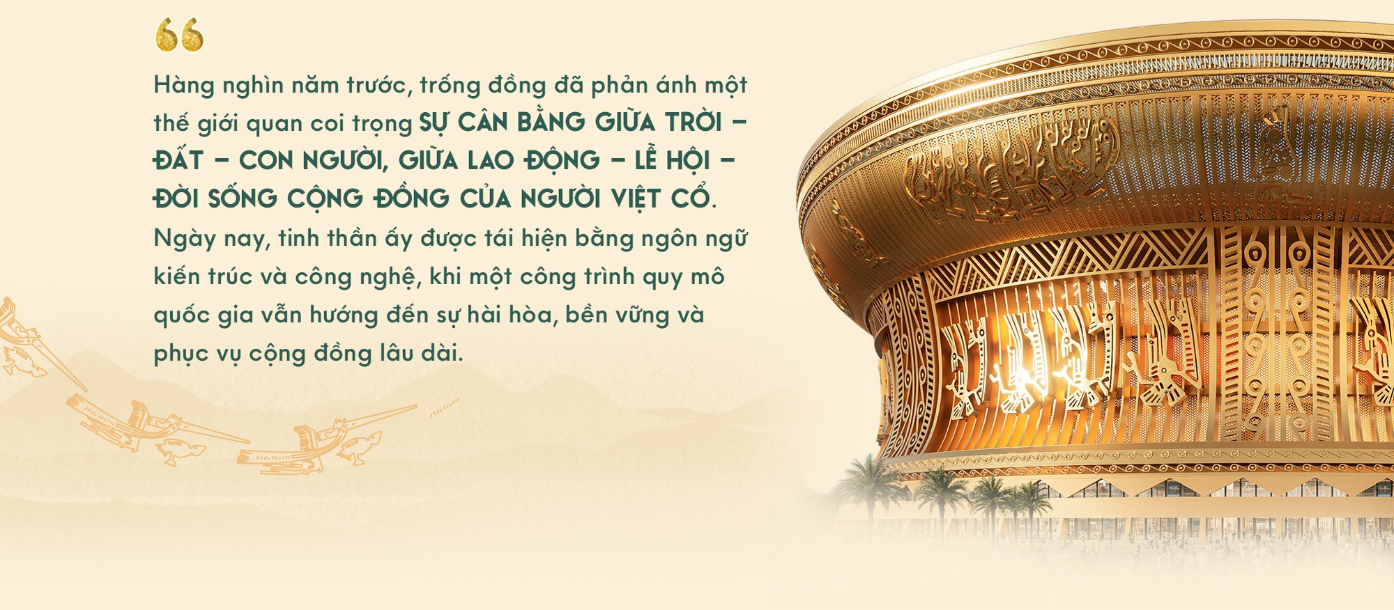 Ngày nay, biểu tượng ấy đang được “đánh thức” theo một cách khác. Không còn chỉ nằm yên trong không gian trưng bày, trống đồng bước ra đời sống đương đại thông qua kiến trúc Sân vận động Trống Đồng, góp phần nâng cao vị thế Thủ đô Hà Nội trên bản đồ thể thao - văn hóa châu lục và quốc tế, tạo động lực phát triển bền vững trong nhiều thập kỷ tiếp theo.