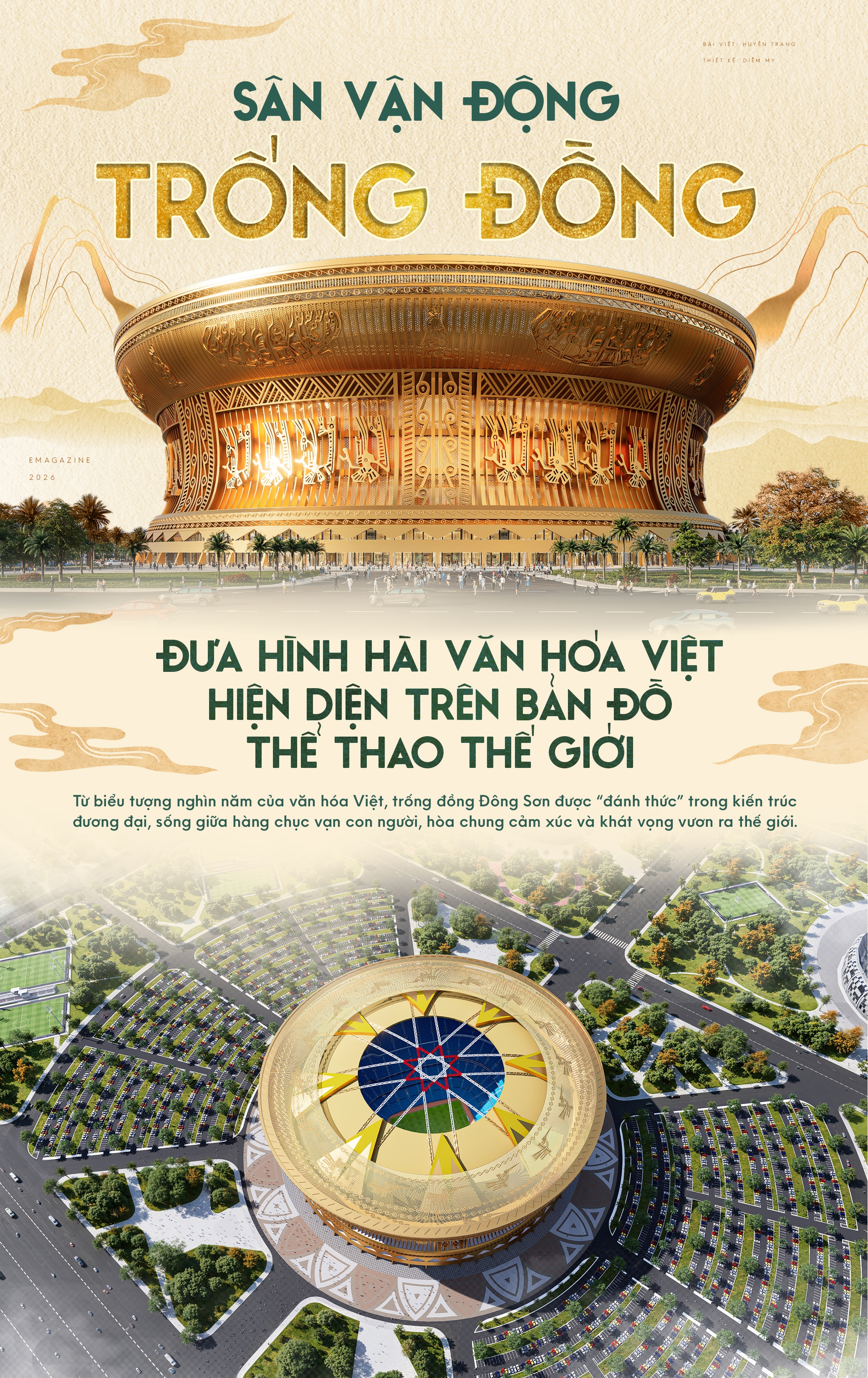 Chính tại điểm giao thoa ấy, hình tượng trống đồng tìm được một “đời sống” mới trong kiến trúc. Việc lựa chọn thiết kế trống đồng cho sân vận động không phải là sự gán ghép mang tính biểu tượng bề mặt, mà là sự tương đồng sâu sắc về chức năng văn hóa: cùng là trung tâm quy tụ, cùng là nơi dẫn dắt cảm xúc tập thể, cùng mang tinh thần cộng đồng làm cốt lõi.