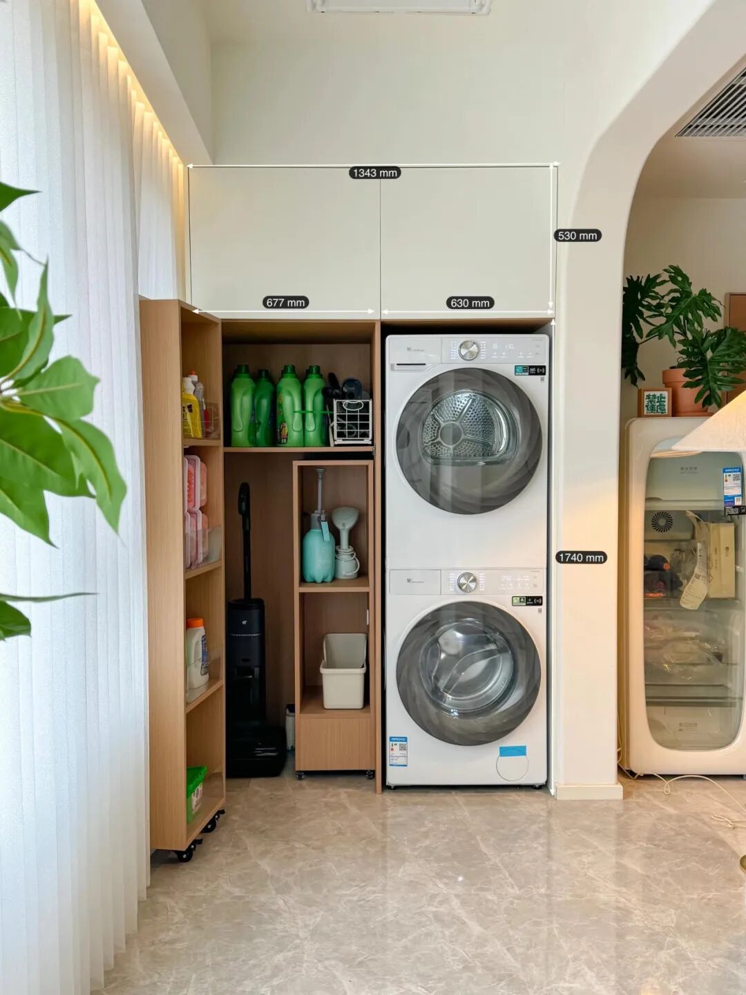 Nhà hàng xóm làm một dãy tủ sâu 60cm, giấu cả máy giặt và máy sấy vào trong. Điều thú vị là họ tận dụng cánh tủ: