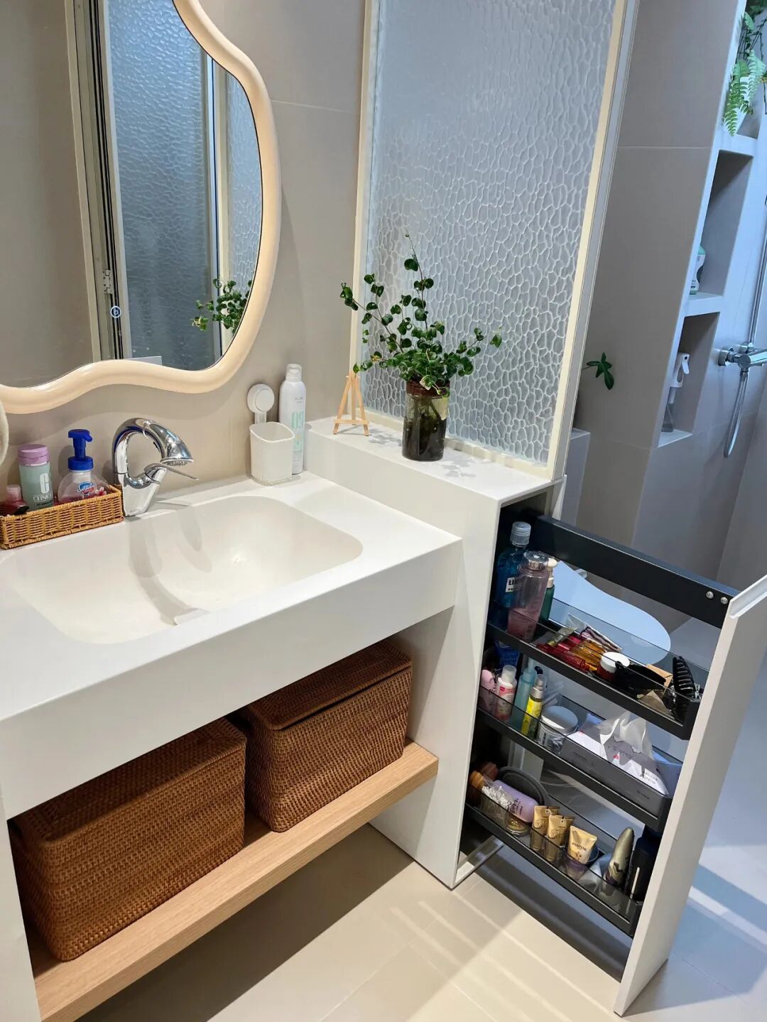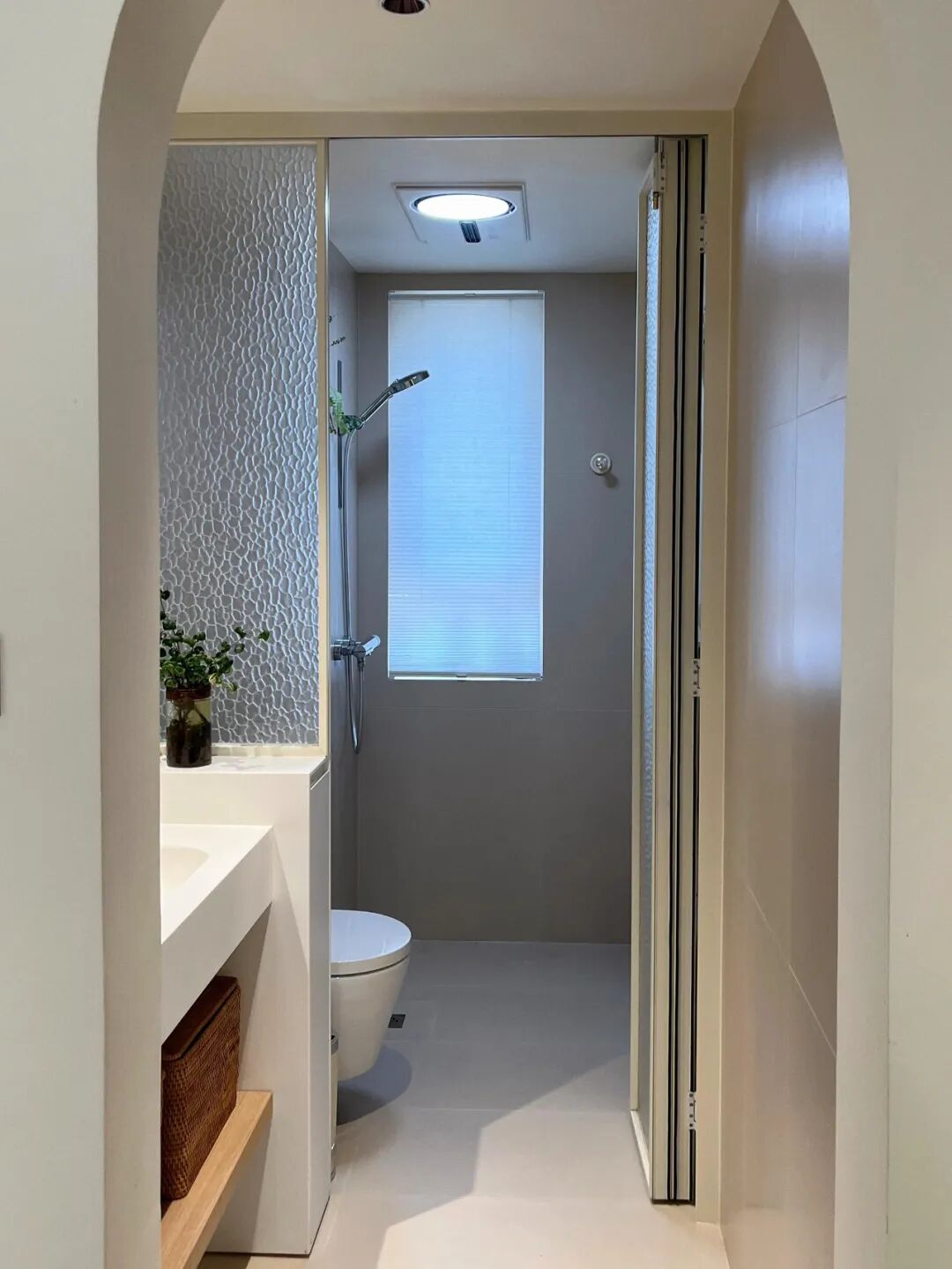 Nhà tôi có vách ngăn khu khô – ướt kiểu mở nên khá sáng, nhưng luôn phải dọn gọn vì nhìn rất dễ bừa.
