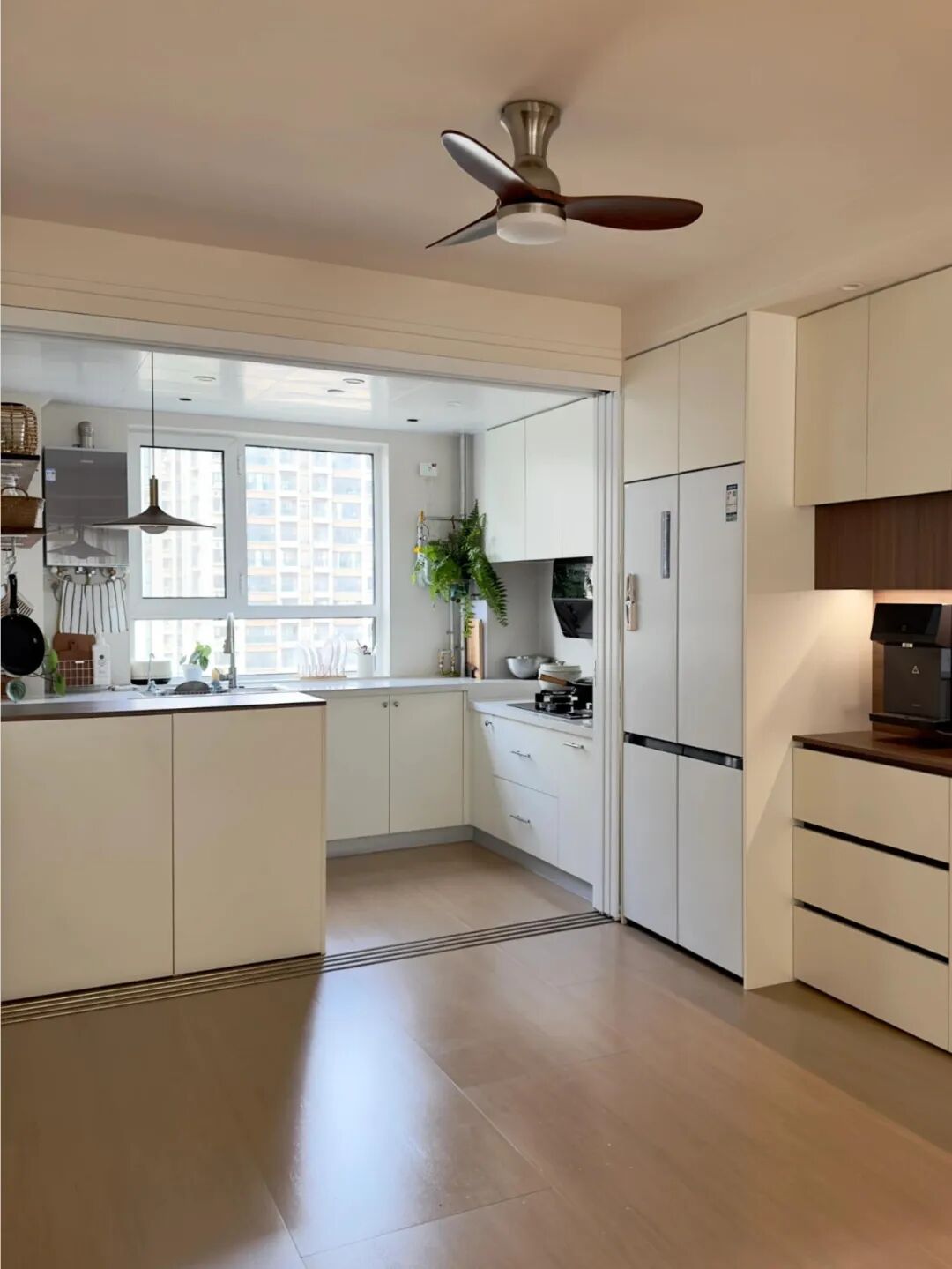 Nhà hàng xóm lại mở rộng toàn bộ khung cửa bếp và dùng hệ cửa trượt nhiều cánh âm tường. Khi mở hết, bếp gần như biến mất vào không gian chung.