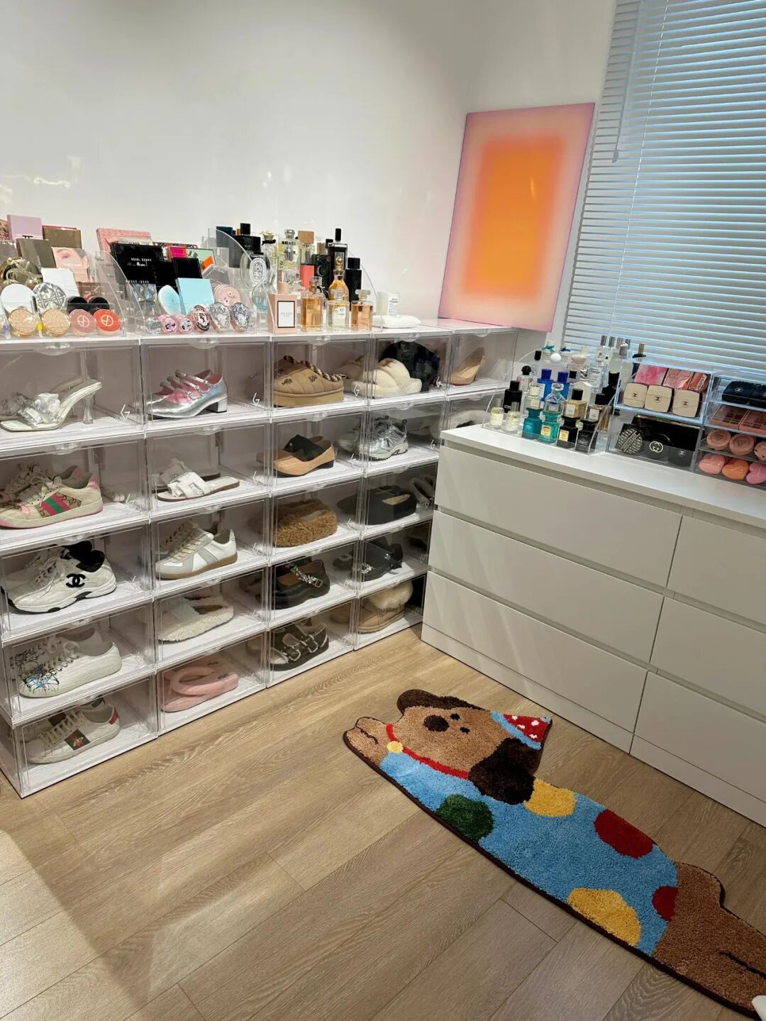 Một bên là hệ tủ kim loại cao kịch trần, bên kia là tủ giày trưng bày, cạnh cửa sổ đặt bàn trang điểm. Khoảng giữa rộng rãi để thay đồ.