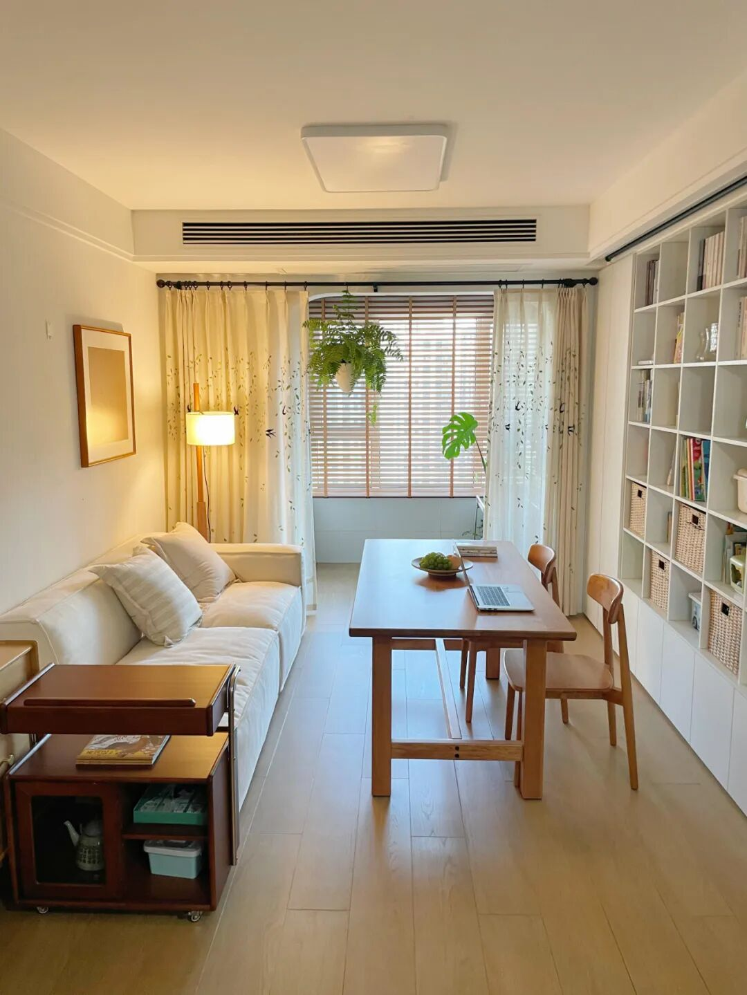 Kết quả: cùng một diện tích nhưng vừa ăn uống, làm việc, đọc sách, xem phim, tiếp khách. Khi cần rộng hơn, họ đẩy bàn ra ban công.