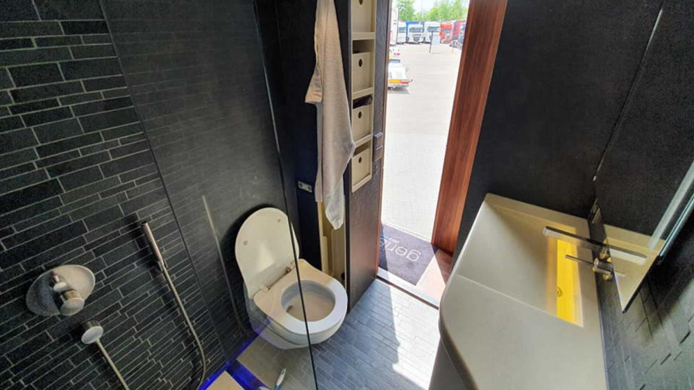 Dựa theo thông tin từ nhà sản xuất, chiếc Scania đã nhận được nhiều trang bị tân tiến và sang trọng không chỉ ở nội thất phía sau mà còn cho cả tài xế và hành khách ngồi ghế trước. Chiếc xe còn được lắp đặt hệ thống điều hướng, camera nhìn phía sau, cảm biến đỗ xe, và một giường ngủ kiểu thả xuống cho không gian ngủ vốn có của khoang lái. Sự kết hợp này tạo nên một phòng ngủ nhỏ ở ngay đầu chiếc RV.