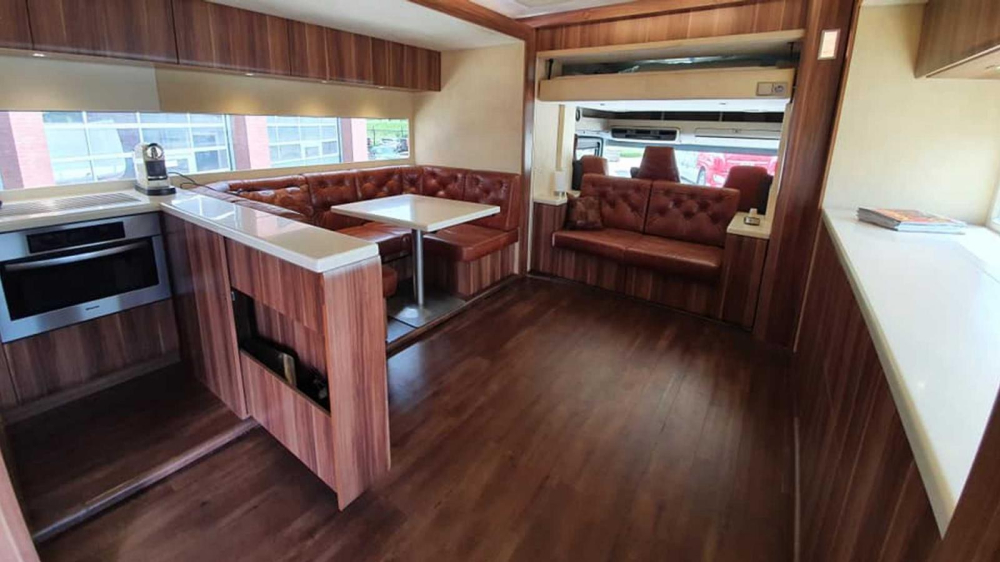 Mọi thứ còn trở nên xa hoa và hoành tráng hơn nữa khi nhìn vào không gian phía sau. Cụ thể, chiếc xe có lắp đặt buồng trượt kép lớn mà giúp mở rộng khu vực bếp và sinh hoạt, qua đó gia tăng đáng kể không gian nội thất. Nhờ thế, chiếc Scania này có sở hữu một nhà bếp đầy đủ tiện nghi với bếp từ 4 ô, một bồn rửa cỡ lớn kèm lò nướng, và một combo tủ lạnh/tủ đông dung tích 185 lít. Khu vực sinh hoạt có trang bị một ghế sofa lớn và một chiếc TV màn hình phẳng cỡ 32 inch – một trong ba chiéc TV trong xe.