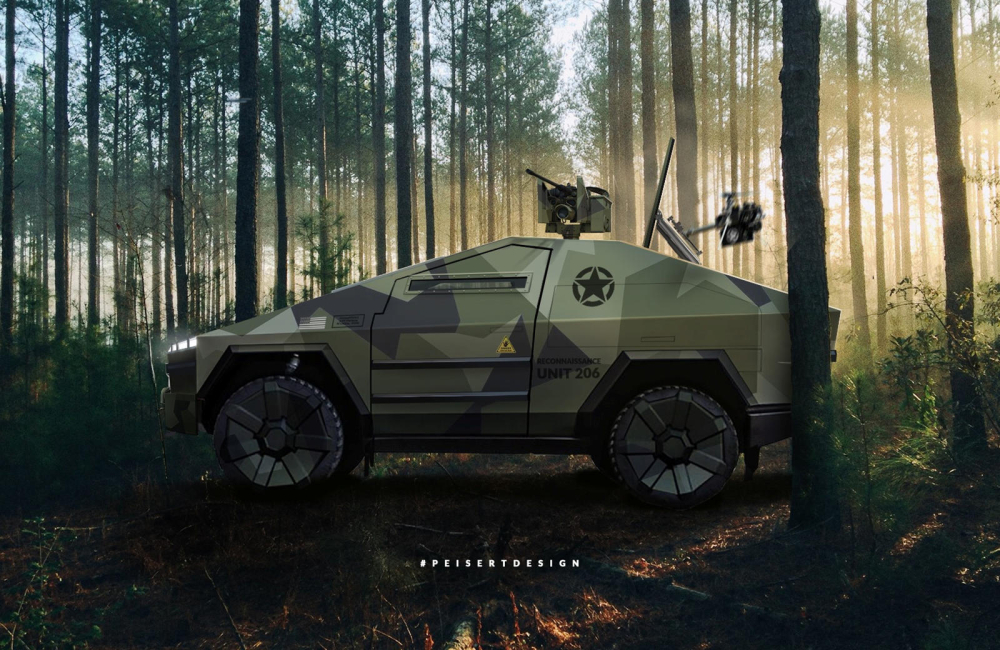 Thêm vào đó, Cybertruck cũng được tưởng tượng trong vai trò một phương tiện vận chuyển quân sự 12 ghế ngồi để thay thế Humvee, với một cabin bổ sung với 6 ghế, một khẩu súng máy đặt trên nóc, và thậm chí một máy bay drone điều khiển từ xa.