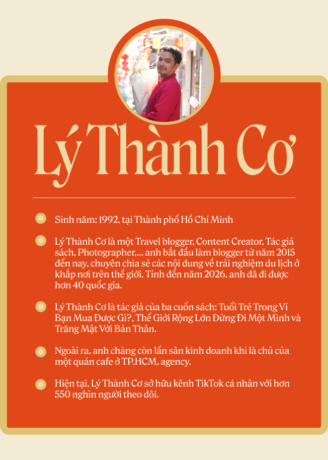 Với cộng đồng ưa xê dịch tại Việt Nam, cái tên Lý Thành Cơ từ lâu đã không còn xa lạ. Trong hơn 10 năm rong ruổi khám phá thế giới, hàng nghìn bài viết, video về du lịch của anh đã góp phần mang lại cảm xúc tích cực, tạo động lực cho hàng nghìn bạn trẻ theo đuổi đam mê xê dịch. Những bài viết, video chia sẻ trải nghiệm, gợi ý cho khán giả những lộ trình phù hợp, địa danh đặc biệt, món ngon hay nét đặc trưng văn hóa của các dân tộc nơi anh đi qua đã trở thành cẩm nang gối đầu giường cho rất nhiều chuyến đi của các bạn trẻ Việt Nam.