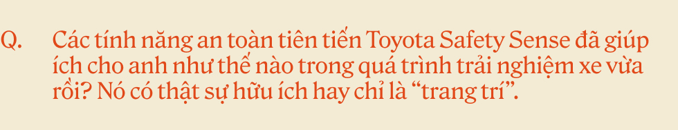 Thật sự mấy tình huống hay gặp như xe máy tạt đầu bất ngờ, đổi làn hay băng ngang qua khi mình đang chạy… thì hệ thống Toyota Safety Sense của Toyota phát huy tác dụng khá rõ cho mình là xe sẽ cảnh báo sớm khi khoảng cách không an toàn, có lúc mình gặp tình huống xe hỗ trợ phanh giúp mình phản ứng kịp hơn. Thực tế là mình vẫn chủ động lái, nhưng những hệ thống này giống như một lớp backup an toàn cho mình vậy, giúp mình yên tâm hơn khi di chuyển, mình thấy khá đáng đó.