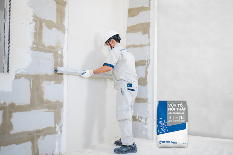 Không chỉ khắc phục các vấn đề thường gặp của tường tô trát hoàn thiện, vữa tô nội thất gốc thạch cao Vĩnh Tường-Gyproc còn giúp tiết kiệm thời gian thi công, các bước chuẩn bị đơn giản, trộn sẵn, có thể thi công ngay. Loại vữa này giúp rút ngắn thời gian chờ hoàn thiện sơn bả, chỉ sau 24 giờ có thể sang giai đoạn tiếp theo, thay vì phải chờ từ 14-28 ngày như vữa tô xi măng truyền thống.