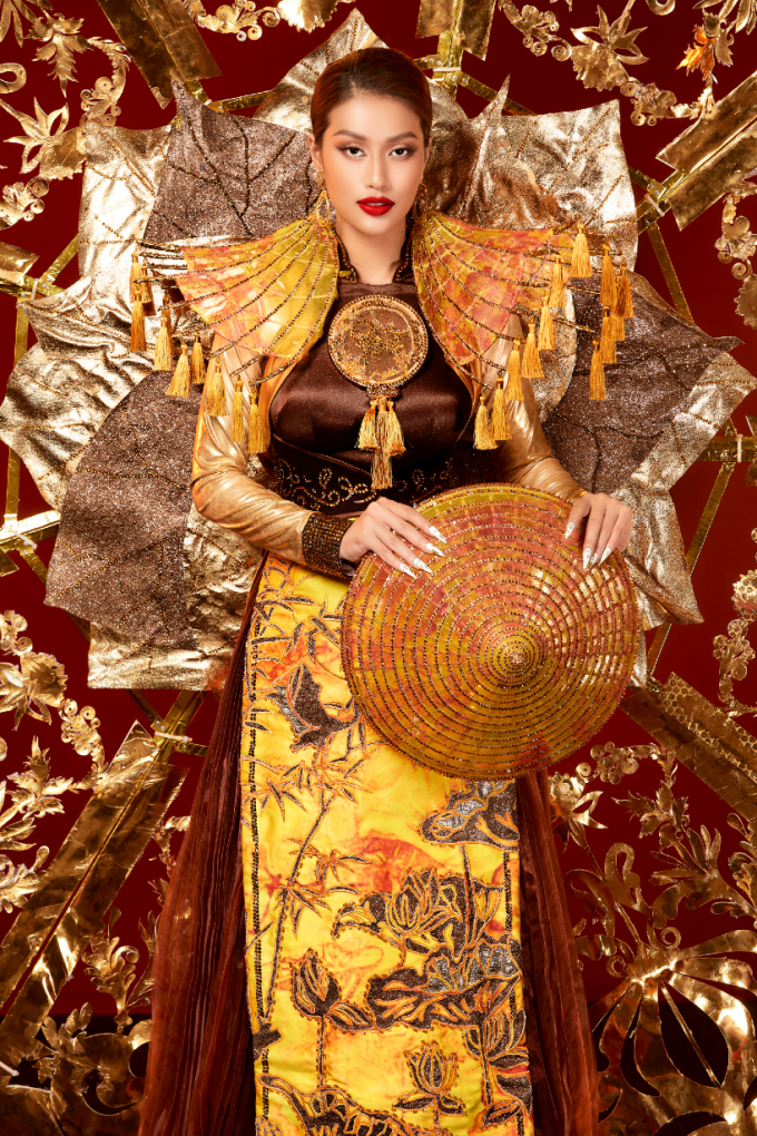 Trong từng shoot hình, hoa hậu Đoàn Thiên Ân thần thái đầy quyền lực khi khoác lên mình bộ trang phục mang đậm bản sắc Việt Nam. Sử dụng màu vàng là màu chủ đạo của dòng tranh trúc chỉ, nhà thiết kế Trần Thanh Tâm (thành viên của đội mentor NTK Vũ Việt Hà) đã tinh tế, khéo léo lồng ghép những giá trị văn hóa nghệ thuật đầy ý nghĩa của Việt Nam lên từng chi tiết cho bộ áo dài dân tộc Việt Nam.