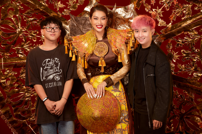 Đoàn Thiên Ân cùng với nhà thiết kế Trần Thanh Tâm và mentor NTK Vũ Việt Hà![]()